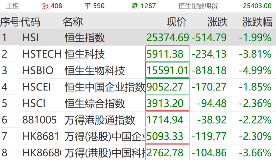 港股市场同步走低,恒生指数跌近2%,恒生科技指数跌超3.8%。