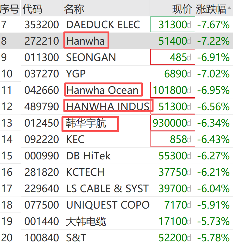 韩国综指跌近1%,韩华海洋、韩华宇航等“韩华系”集体大跌。