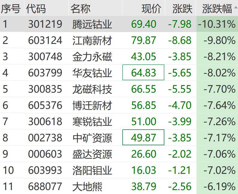 能源金属、有色金属板块大幅回落,腾远钴业跌超10%。