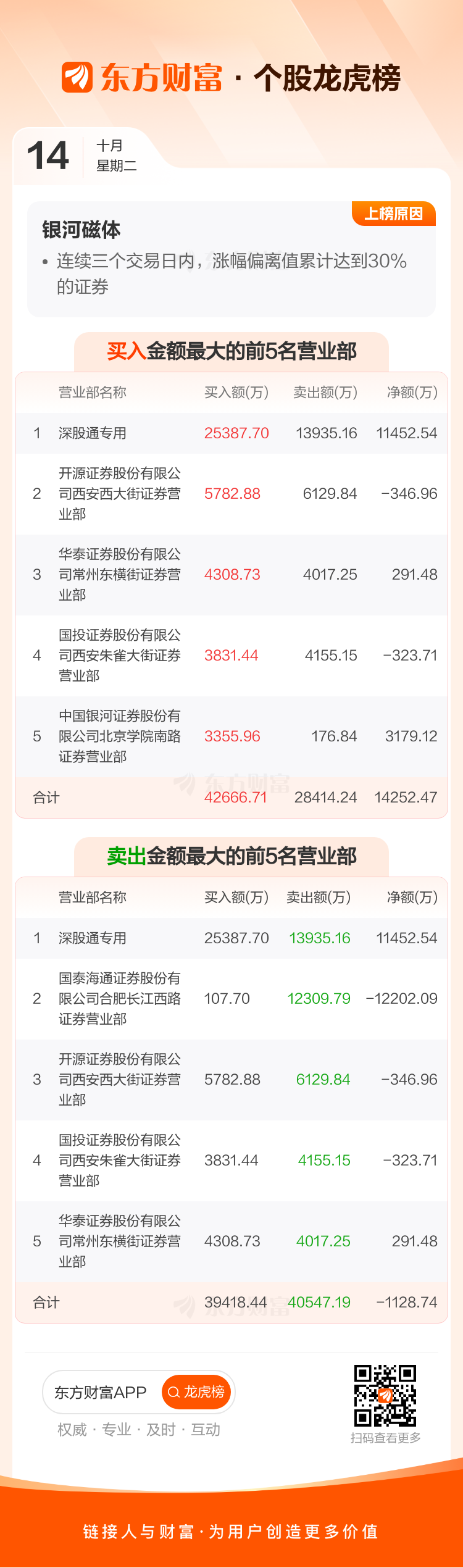 交易所2025年10月14日公布的交易公开信息显示,银河磁体因成为连续三个交易日内,涨幅偏离值累计达到30%的证券上榜。银河磁体当日收报40.75元,涨跌幅5.19%,换手率24.77%,成交额23.70亿。异常期间10月13日至10月14日,期间涨幅26.24%,累计偏离值30.02%,区间成交额37.88亿。