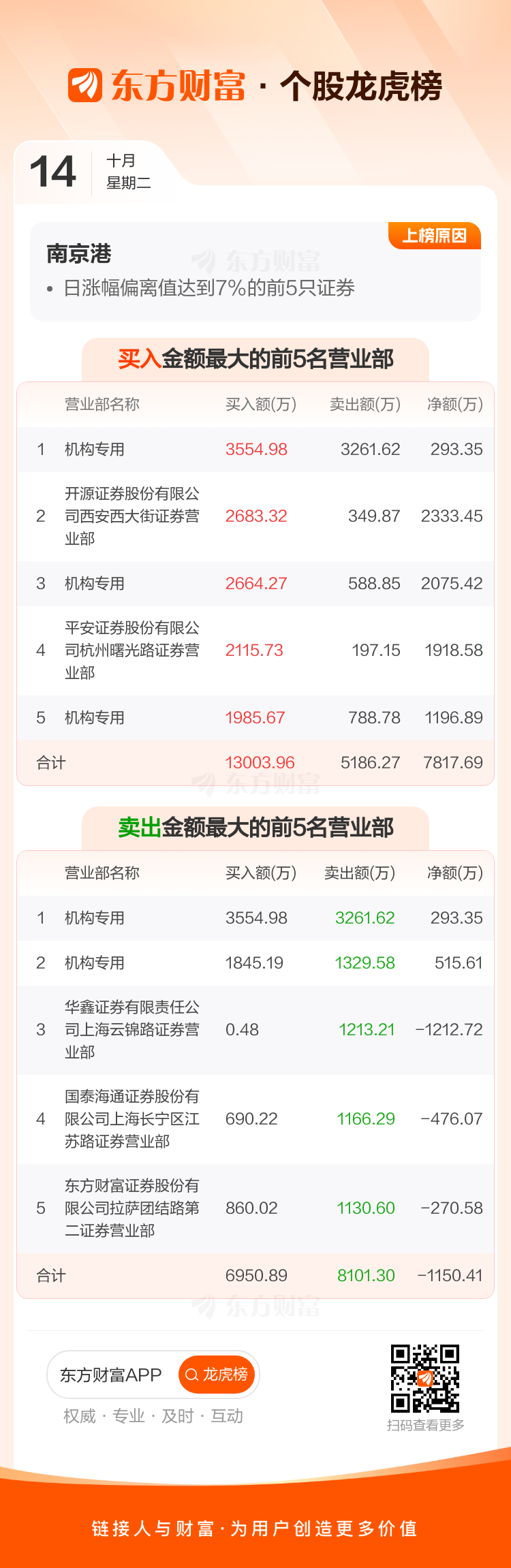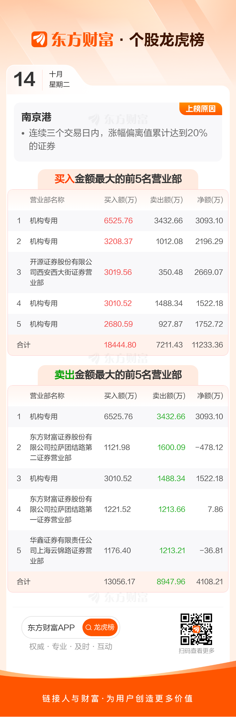 交易所2025年10月14日公布的交易公开信息显示,南京港因成为日涨幅偏离值达到7%的前5只证券、连续三个交易日内,涨幅偏离值累计达到20%的证券上榜。南京港当日收报12.5元,涨跌幅10.04%,偏离值11.91%,换手率18.81%,成交额11.00亿。异常期间10月13日至10月14日,期间涨幅21.01%,累计偏离值23.64%,区间成交额16.32亿。