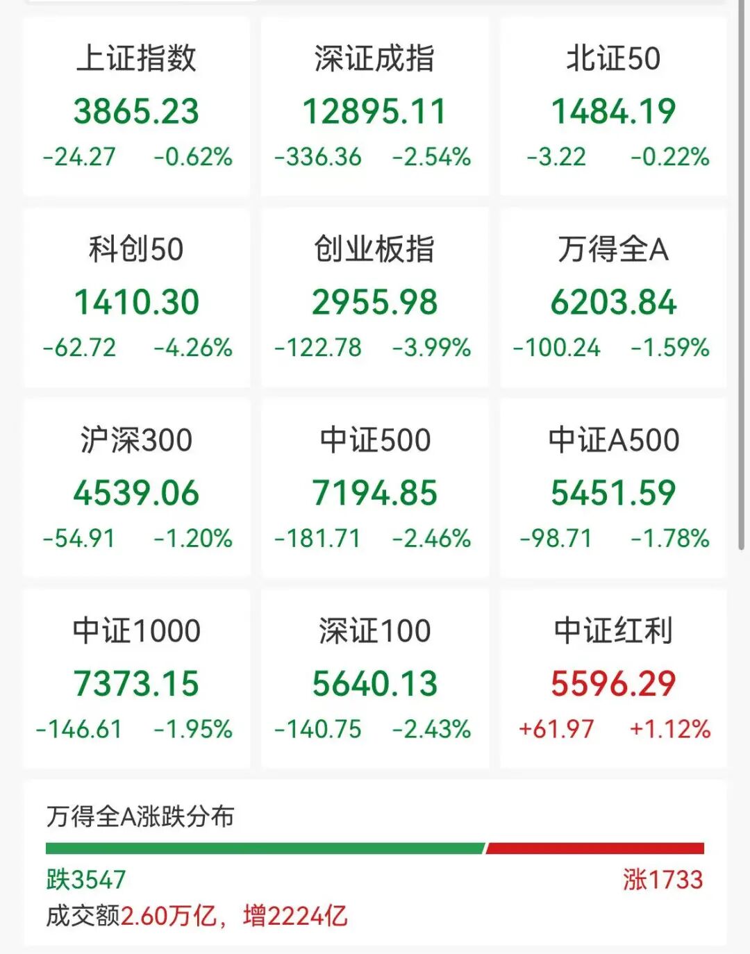 受累亚太市场走低,A股市场全天震荡调整,创业板指、科创50指数盘中双双跌超4%。截至收盘,沪指跌0.62%,深成指跌2.54%,创业板指跌3.99%。沪深两市成交额2.60万亿,较上一个交易日放量2224亿。