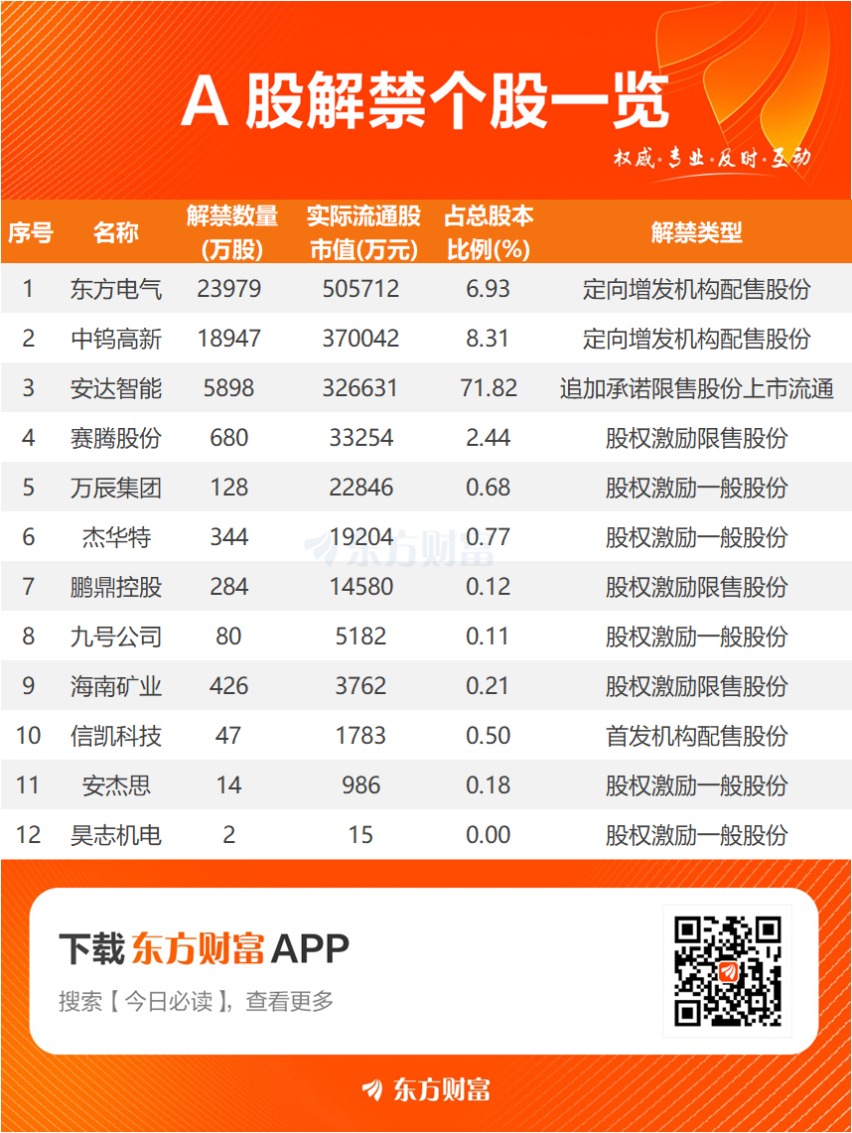 【明日解禁】明日12股解禁 东方电气、中钨高新解禁市值居前
