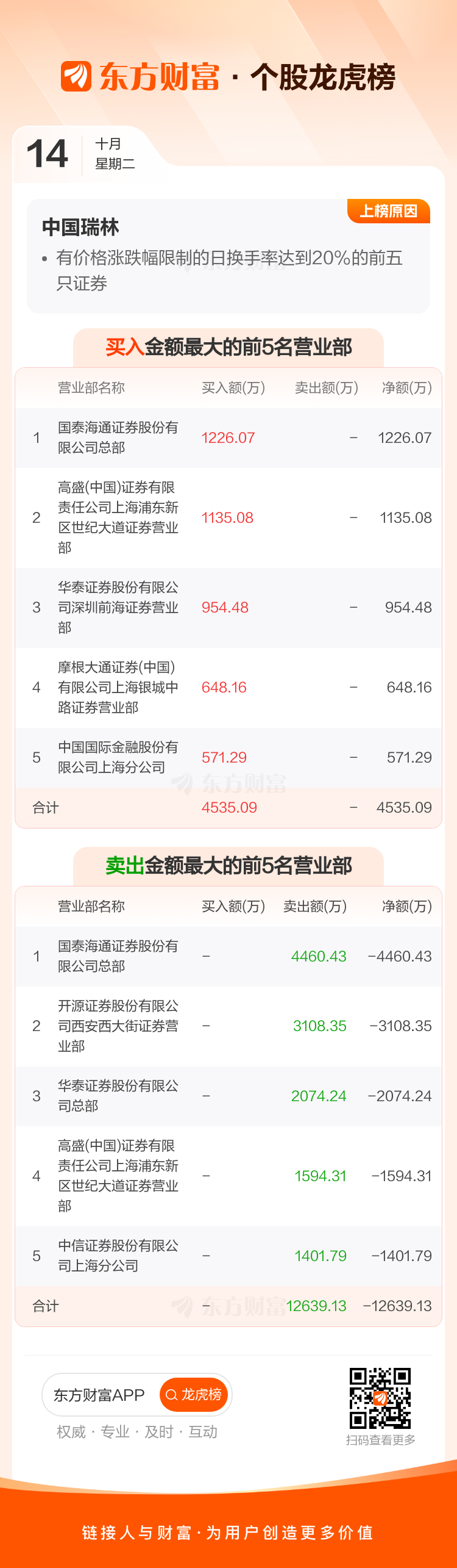 交易所2025年10月14日公布的交易公开信息显示,中国瑞林因成为有价格涨跌幅限制的日换手率达到20%的前五只证券上榜。中国瑞林当日收报74.02元,涨跌幅-1.84%,偏离值42.75%,换手率42.75%,成交额8.17亿。
