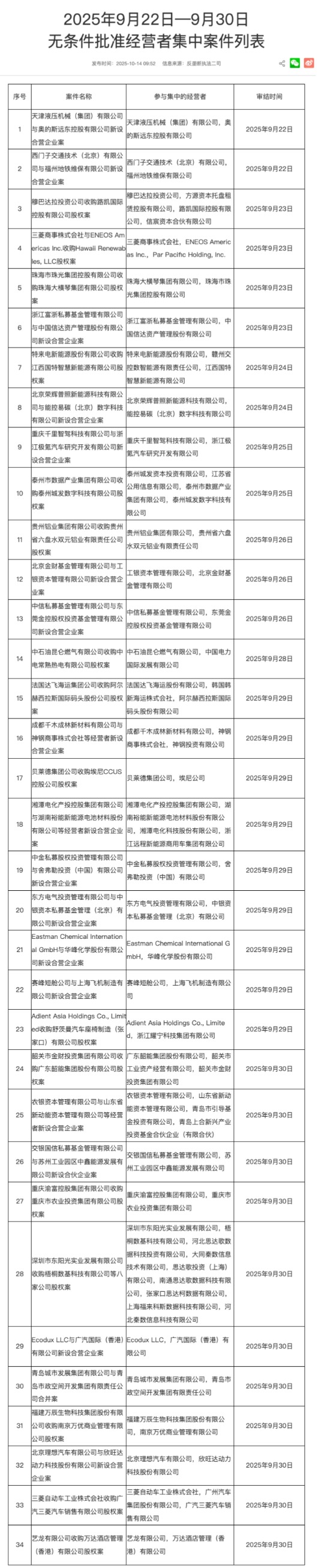 市场监管总局发布2025年9月22日-9月30日无条件批准经营者集中案件列表,其中包括重庆千里智驾科技有限公司与浙江极氪汽车研究开发有限公司新设合营企业案、赛峰短舱公司与上海飞机制造有限公司新设合营企业案、北京理想汽车有限公司与欣旺达动力科技股份有限公司新设合营企业案、三菱自动车工业株式会社收购广汽三菱汽车销售有限公司股权案、艺龙有限公司收购万达酒店管理(香港)有限公司股权案。