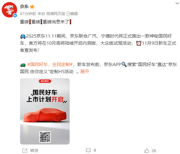 京东官方微博10月14日消息,2025年京东“双11”期间,京东将联合广汽、宁德时代推出一款汽车,官方将在10月底陆续开启内测版、大众版试驾活动,11月9日新车正式官宣发布。