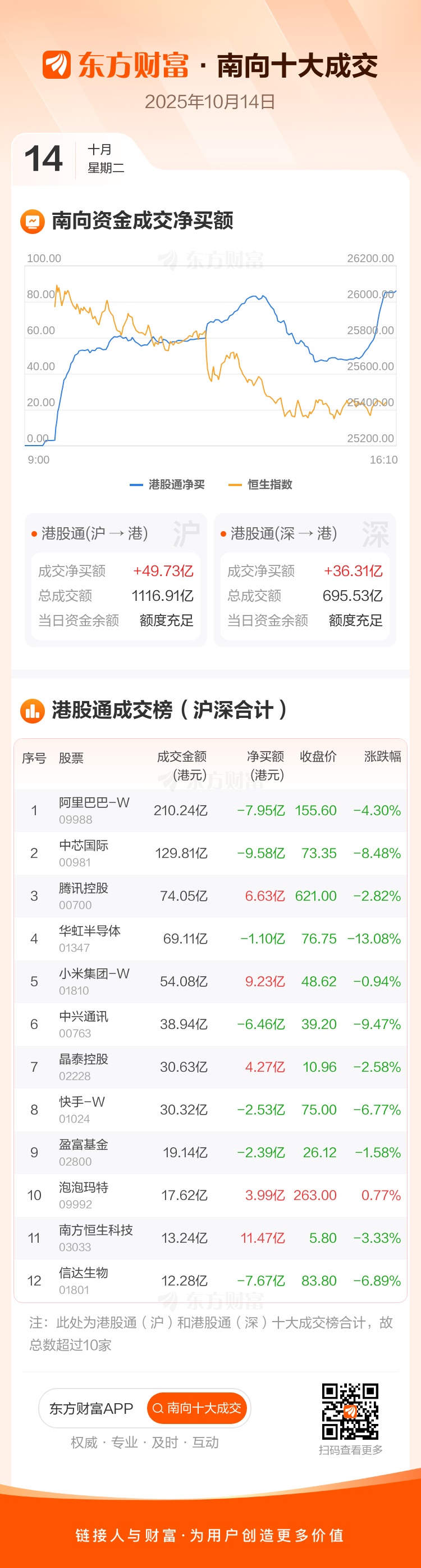 10月14日南向资金净买逾86亿港元,逾11亿抢筹南方恒生科技