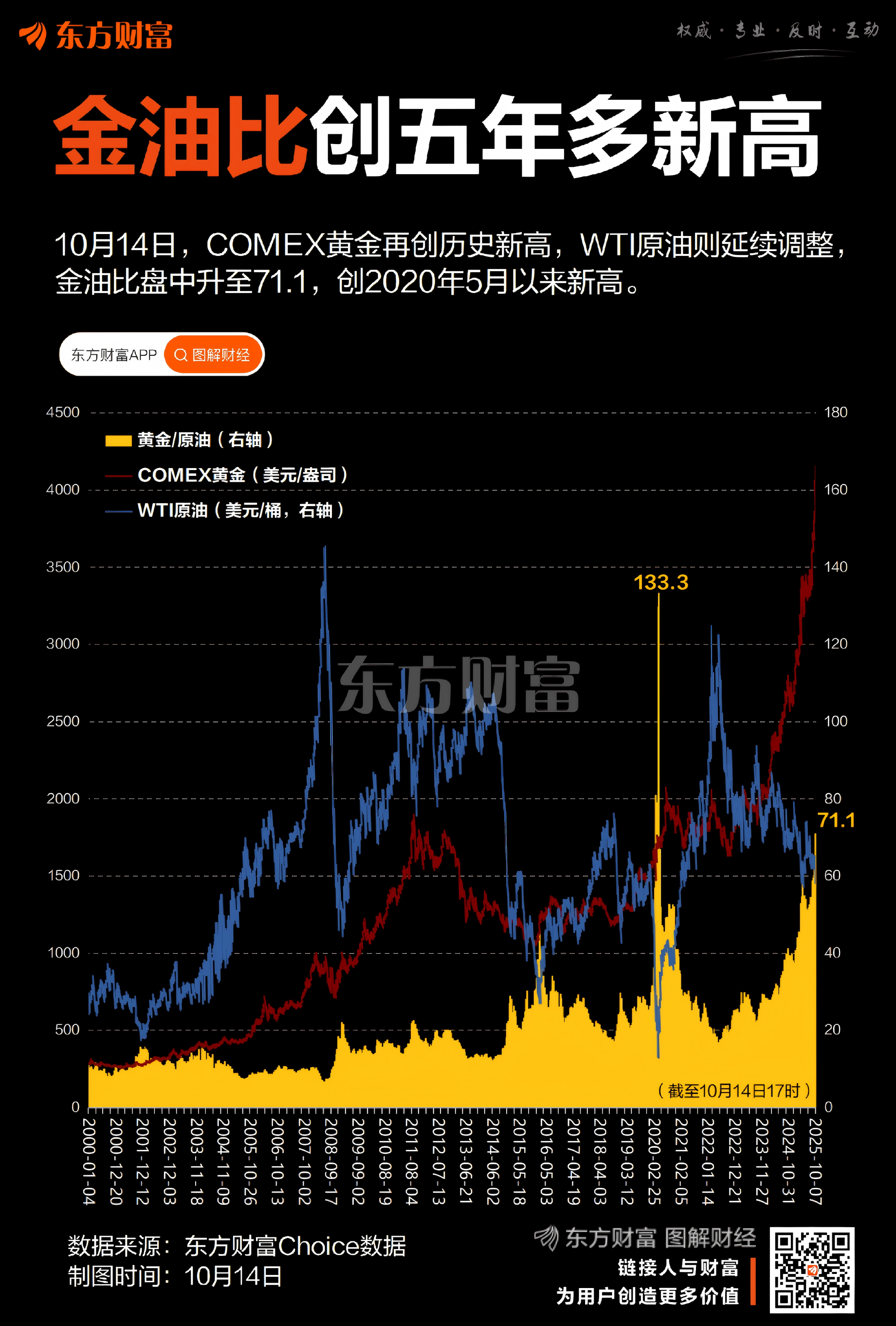 10月14日,COMEX黄金盘中一度涨至4190.9美元/盎司,再创历史新高;WTI原油则延续调整,最新价已接近58美元/桶,金油比随之升破70整数大关,创下2025年5月以来的新高。