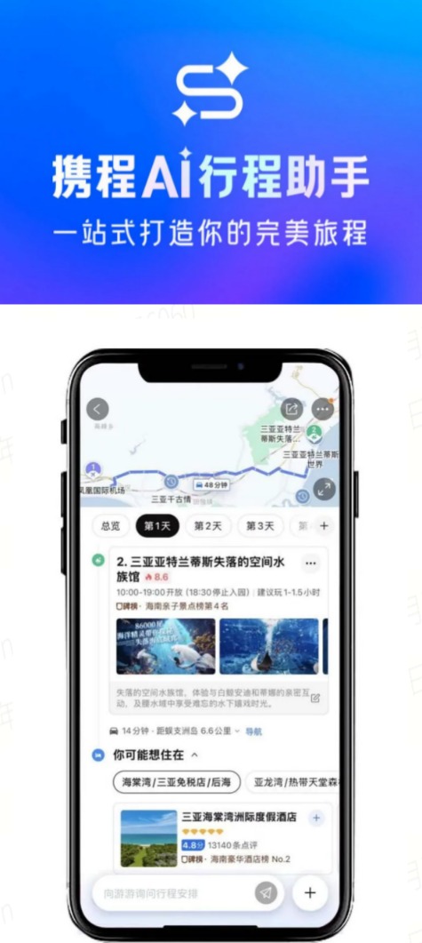 “AI行程助手”依托携程全球2000万旅游兴趣点与数亿用户真实反馈,实现了从行程规划到机票、酒店、景点门票预订的无缝闭环。用户只需输入“目的地与出行天数”等需求,AI即可结合口碑榜真实评价与实时数据,智能推荐最优方案,彻底告别反复查阅、信息碎片化的低效规划模式。同时,AI行程助手融合AI智能规划与人工定制师服务,支持可视化地图查看与编辑行程,用户可在系统推荐基础上自由调整与优化,轻松生成真正可落地执行的专属旅行计划。