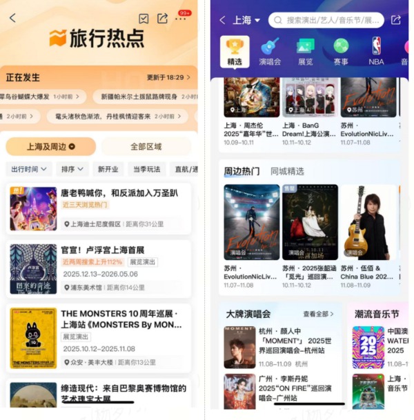 携程热点频道每月更新超过5000个旅行热点,覆盖全球100多个目的地:“故宫的桂花开满了”“俄罗斯对中国免签”“迪士尼万圣派对开启”等热点资讯,都可以在热点频道找到。除此以外,去悉尼跑马拉松、去苏州看伍佰演唱会等赛事展演活动也成为新的旅行趋势。全球节演频道每年上新全球10万场演唱会、音乐节、赛事、展览、演出信息。