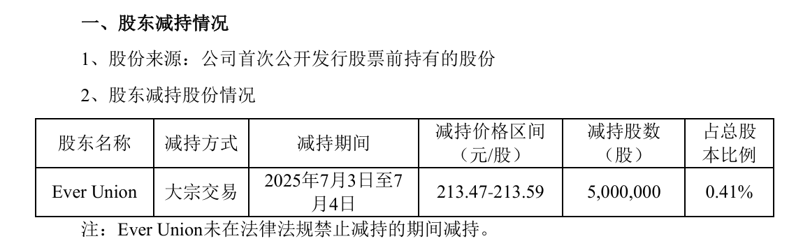 值得一提的是,今年7月,迈瑞医疗股东Ever Union通过大宗交易的方式减持公司股份500万股,减持均价为213.47元/股至213.59元/股。以此计算,Ever Union减持总金额约10.67亿元。