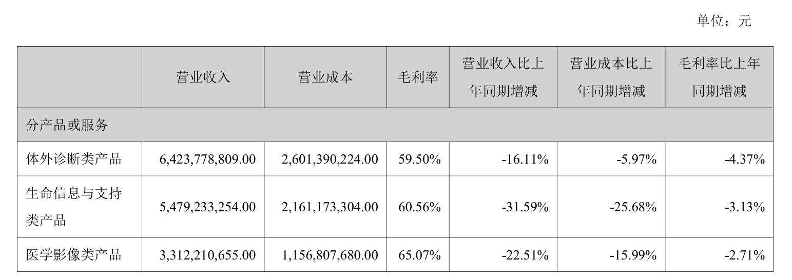 与此同时生命信息与支持业务实现营业收入54.79亿元,同比减少31.59%,毛利率同比减少3.13%;医学影像业务实现营业收入33.12亿元,同比减少22.51%;毛利率同比减少2.71%。