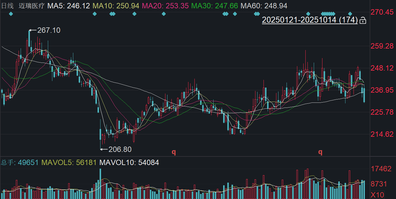 二级市场上,截至14日收盘,迈瑞医疗下跌1.92%报230.68元/股,总市值2796.86亿元,近一年来公司股价累计下跌约17%。