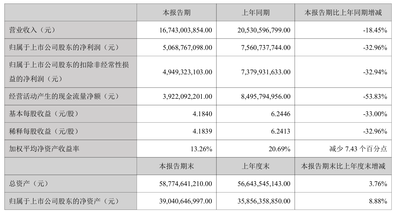 2025年上半年,公司报告期内营业收入约为167.43亿元,同比减少18.45%;归母净利润为50.69亿元,同比减少32.96%;经营性现金流同比减少53.83%至39.22亿元。