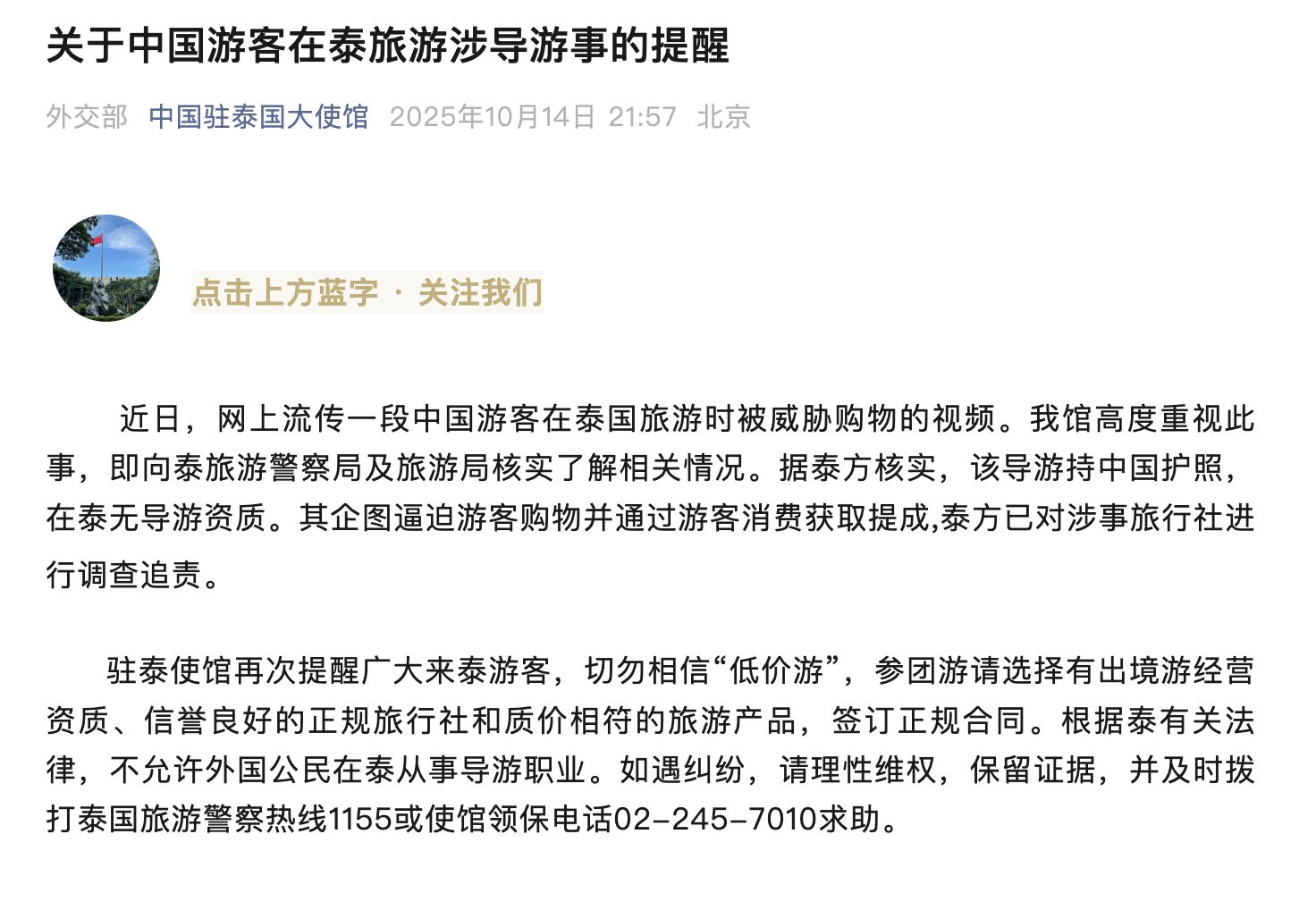 10月14日晚,中国驻泰国大使馆发布《关于中国游客在泰旅游涉导游事的提醒》: