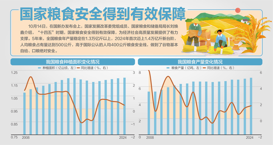 5年来,全国粮食年产量稳定在1.3万亿斤以上,2024年首次迈上1.4万亿斤新台阶,人均粮食占有量比“十三五”期末增加25公斤,达到500公斤,高于国际公认的人均400公斤粮食安全线,做到了谷物基本自给、口粮绝对安全。