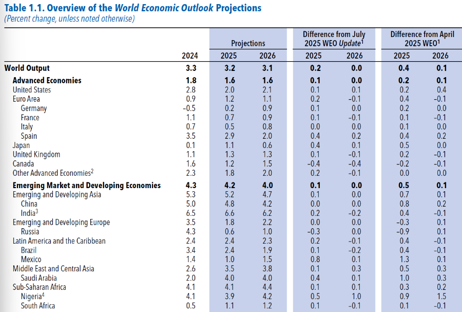 在美国贸易和关税政策的反反复复之下,2025年成为全球经济高度动荡的一年。10月14日,国际货币基金组织(IMF)在最新一期《世界经济展望》中预测,全球增长预计将从2024年的3.3%减速至2025年的3.2%和2026年的3.1%。与2025年7月《世界经济展望更新》相比,本次增长预测变化不大(仅今年的增速被小幅上调0.2个百分点),反映了全球经济对贸易紧张局势的逐步适应。
