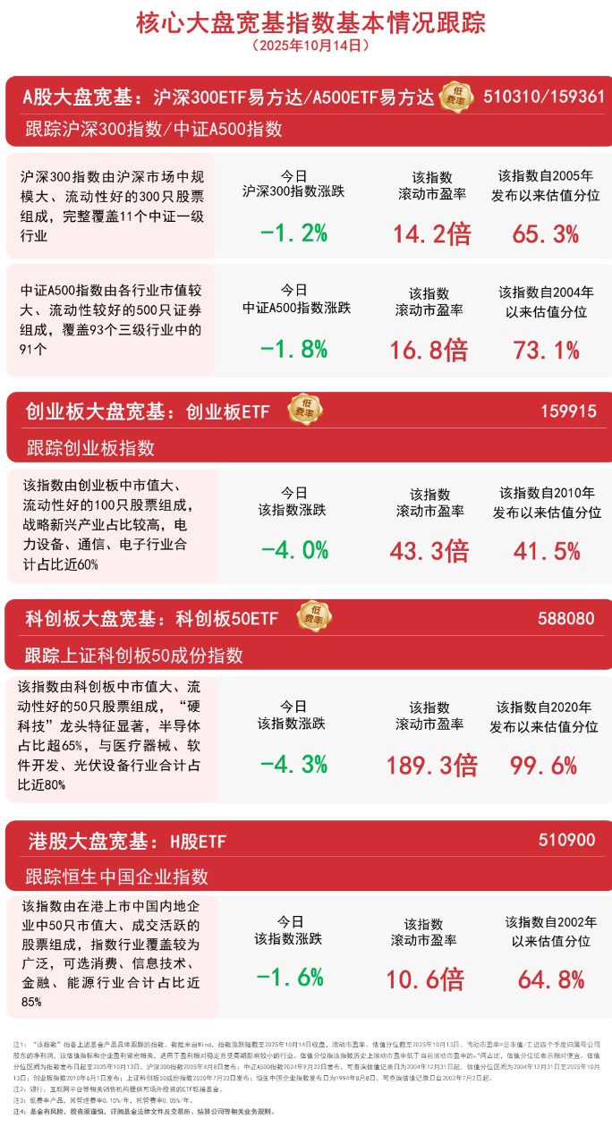 截至收盘,中证A500指数下跌1.8%,沪深300指数下跌1.2%,创业板指数下跌4.0%,上证科创板50成份指数下跌4.3%,恒生中国企业指数下跌1.6%。Wind数据显示,A500ETF易方达(159361)、沪深300ETF易方达(510310)昨日分别获3.6亿元和10.8亿元资金净流入。