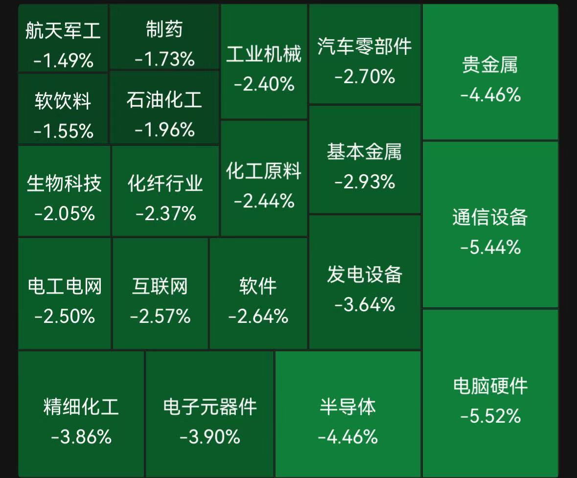 A股市场上,午后贵金属、有色金属个股应声下跌;截至当日收盘,wind贵金属行业板块下跌4.46%,基本金属板块收跌2.93%,其中盛达资源下跌8.39%、洛阳钼业、兴业银锡跌超7%、江西铜业下跌6.81%、紫金矿业下跌5.75%、四川黄金、赤峰黄金等多只个股跌超4%。