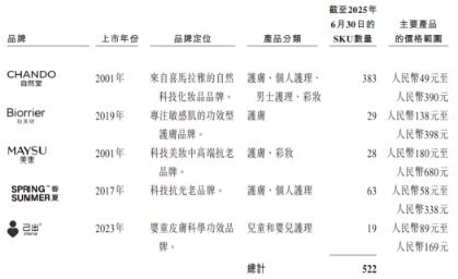 其中,“自然堂”一直是市场认知度最高的品牌,也是集团主要营收来源。自然堂品牌分别于2022年、2023年、2024年以及截至2024年及2025年6月30日止六个月贡献公司总收入的94.6%、95.9%、95.4%、95.6%及94.9%。而在自然堂产品序列中,其核心科研成果“喜默因”应用产品从2022年61款增至2025年86款,贡献超75%营收。