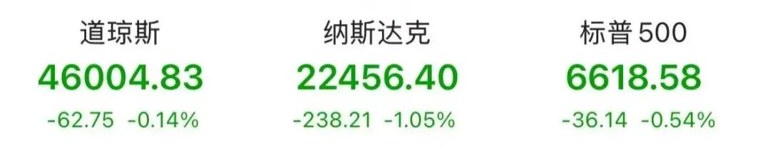10月14日周二,美股三大指数集体低开。截至北京时间23时20分,道指跌0.14%,报46004.83点;纳斯达克指数跌1.05%,报22456.40点;标普500指数跌0.54%,报6618.58点。