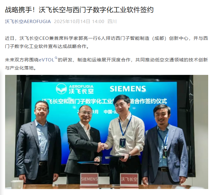 每经AI快讯,近日,沃飞长空与西门子数字化工业软件宣布达成战略合作。未来双方将围绕eVTOL的研发、制造和运维展开深度合作,共同推动低空交通领域的技术创新与产业化落地。
