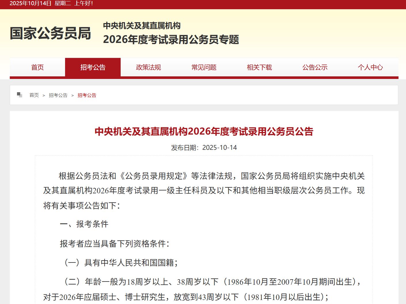10月14日,国家公务员局消息,中央机关及其直属机构2026年度考试录用公务员报名即将开始,共计划招录3.81万人。
