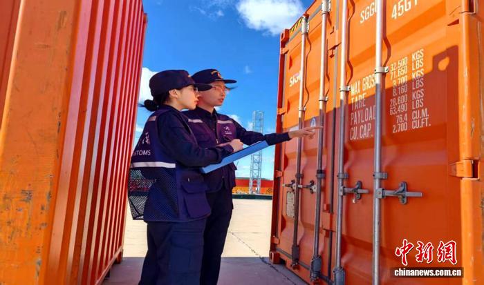 同江海关关员核验集装箱信息。同江市委宣传部供图