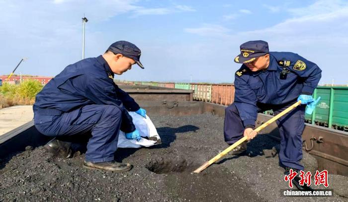 同江海关关员进行煤炭取样查验。同江市委宣传部供图