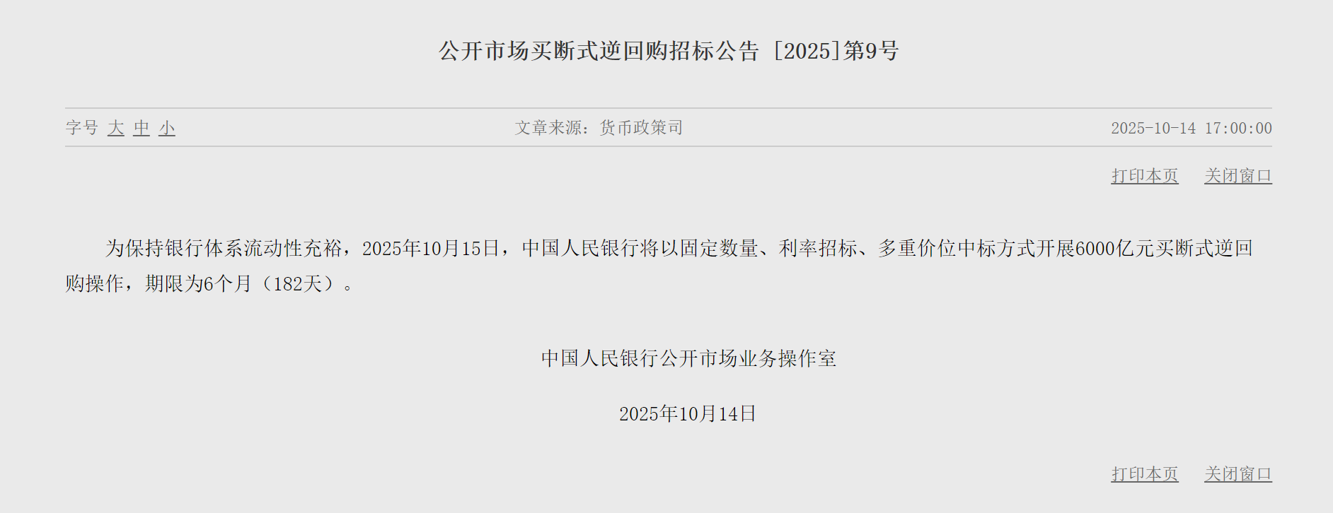 央广网北京10月14日消息(记者冯方)10月14日,央行发布公告称,为保持银行体系流动性充裕,央行将于10月15日以固定数量、利率招标、多重价位中标方式开展6000亿元买断式逆回购操作,期限为6个月(182天)。