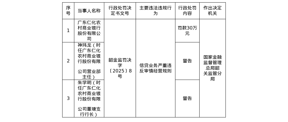 广东仁化农商行被罚30万,涉信贷业务严重违规