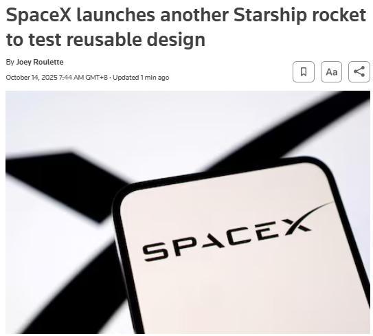 中新网10月14日电据路透社报道,当地时间13日,美国太空探索技术公司(SpaceX)新一代重型运载火箭“星舰”从得克萨斯州发射升空,实施第11次试飞。