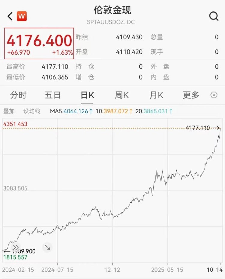 14日,现货黄金涨超1%,史上首次站上4170美元/盎司,再创历史新高,年内累涨超1500美元,涨幅超58%。