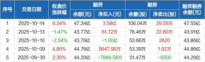 融资方面,当日融资买入15.89亿元,融资偿还12.31亿元,融资净买入3.58亿元,净买入额两市排名第四。融券方面,融券卖出37.78万股,融券偿还8.19万股,融券余量106.04万股,融券余额2044.52万元。融资融券余额合计47.55亿元。