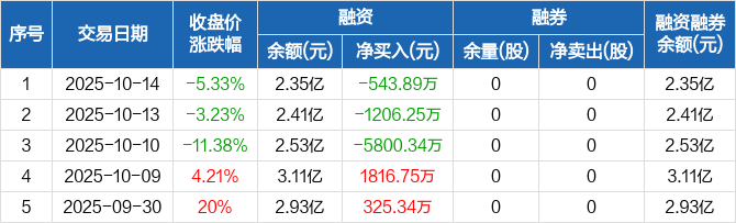 融资方面,当日融资买入4424.87万元,融资偿还4968.76万元,融资净偿还543.89万元,连续3日净偿还累计7550.48万元。融券方面,融券卖出0股,融券偿还0股,融券余量0股,融券余额0元。融资融券余额合计2.35亿元。
