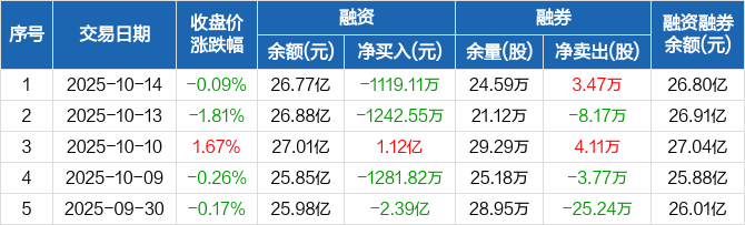 融资方面,当日融资买入2.13亿元,融资偿还2.24亿元,融资净偿还1119.11万元。融券方面,融券卖出8.35万股,融券偿还4.88万股,融券余量24.59万股,融券余额279.83万元。融资融券余额合计26.8亿元。