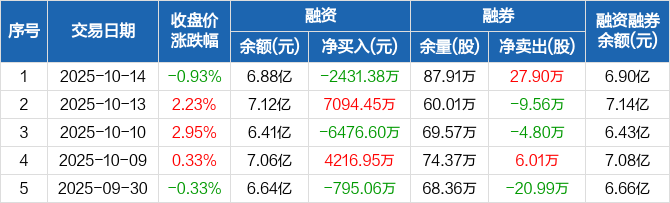 融资方面,当日融资买入7965.49万元,融资偿还1.04亿元,融资净偿还2431.38万元。融券方面,融券卖出30.1万股,融券偿还2.2万股,融券余量87.91万股,融券余额279.55万元。融资融券余额合计6.9亿元。