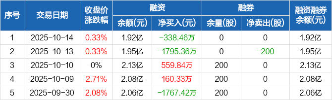 怡球资源融资融券信息显示,2025年10月14日融资净偿还338.46万元;融资余额1.92亿元,较前一日下降1.73%