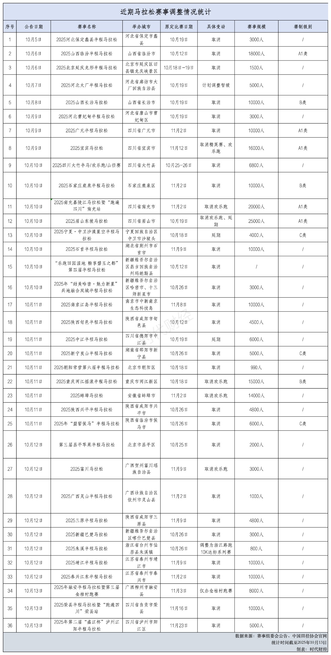 据时代财经不完全统计,10月1日以来,全国各地至少有36场马拉松赛突然官宣取消或调整。其中,以区县举办的马拉松赛事居多,也不乏高规格A1类比赛。