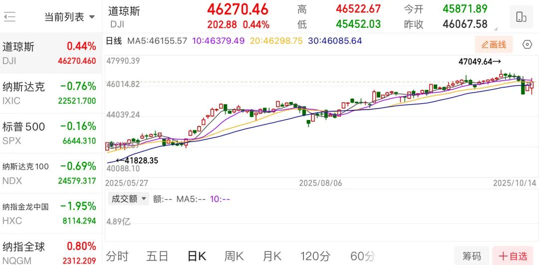 当地时间10月14日,美股三大指数低开后震荡回升,尾盘小幅跳水,最终收盘涨跌不一,道指涨0.44%报46270.46点,标普500指数跌0.16%报6644.31点,纳指跌0.76%报22521.7点。