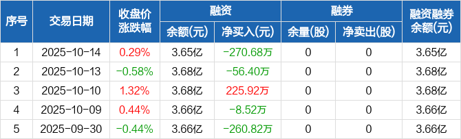 融资方面,当日融资买入241.54万元,融资偿还512.21万元,融资净偿还270.68万元。融券方面,融券卖出0股,融券偿还0股,融券余量0股,融券余额0元。融资融券余额合计3.65亿元。