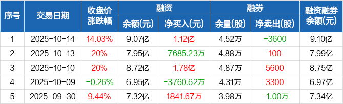 新莱应材融资融券信息显示,2025年10月14日融资净买入1.12亿元;融资余额9.07亿元,创历史新高,较前一日增加14.05%。
