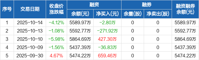 普蕊斯:融资净偿还2.8万元,融资余额5589.97万元(10-14)