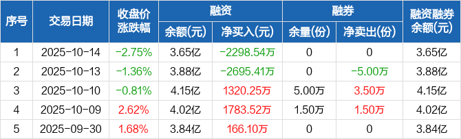 融资方面,当日融资买入7097.91万元,融资偿还9396.45万元,融资净偿还2298.54万元。融券方面,融券卖出0份,融券偿还0份,融券余量0份,融券余额0元。融资融券余额合计3.65亿元。