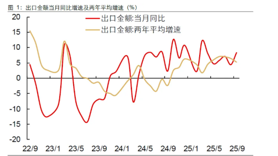 出口方面,在去年同期基数较低的背景下,9月我国出口金额同比增速明显回升,主要支撑力量依旧集中于非美国家和地区,对美出口降幅仅小幅收窄至-27%。展望后续,虽然近期特朗宣称将从11月1日起对中国产品加征100%关税带来不确定性,但目前我国出口对美依赖度已逐渐减弱,且中高端产品全球竞争力的提升也有望持续为我国出口提供韧性。不过需留意去年四季度我国出口同比增速较高,可能对后续出口读数构成一定影响。