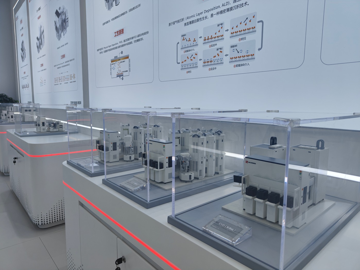 新凯来展台展出了光学检测BFI产品岳麓山、物理与X射线量测设备XPS赤霞山-XP、刻蚀产品ETCH武夷山、扩散产品EPI峨眉山和RTP三清山、薄膜产品PVD普陀山及ALD阿里山、CVD长白山。