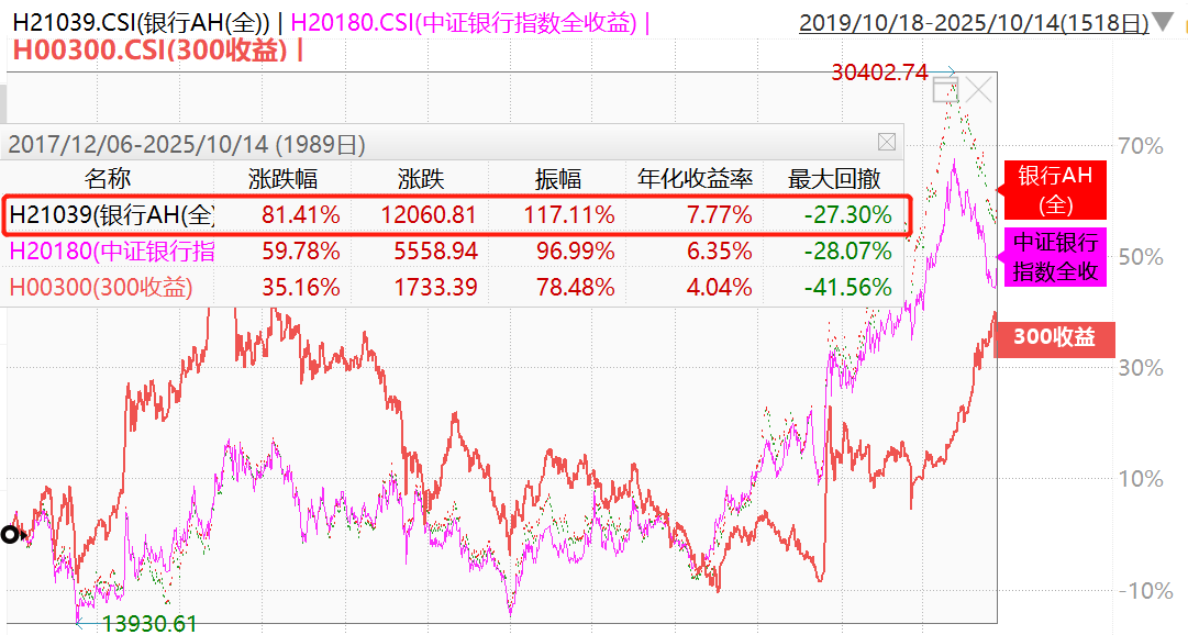 自2017年12月6日指数发布以来,银行AH全收益指数累计涨81.41%,同期中证银行全收益指数涨59.78%,相对超额收益21.63%。