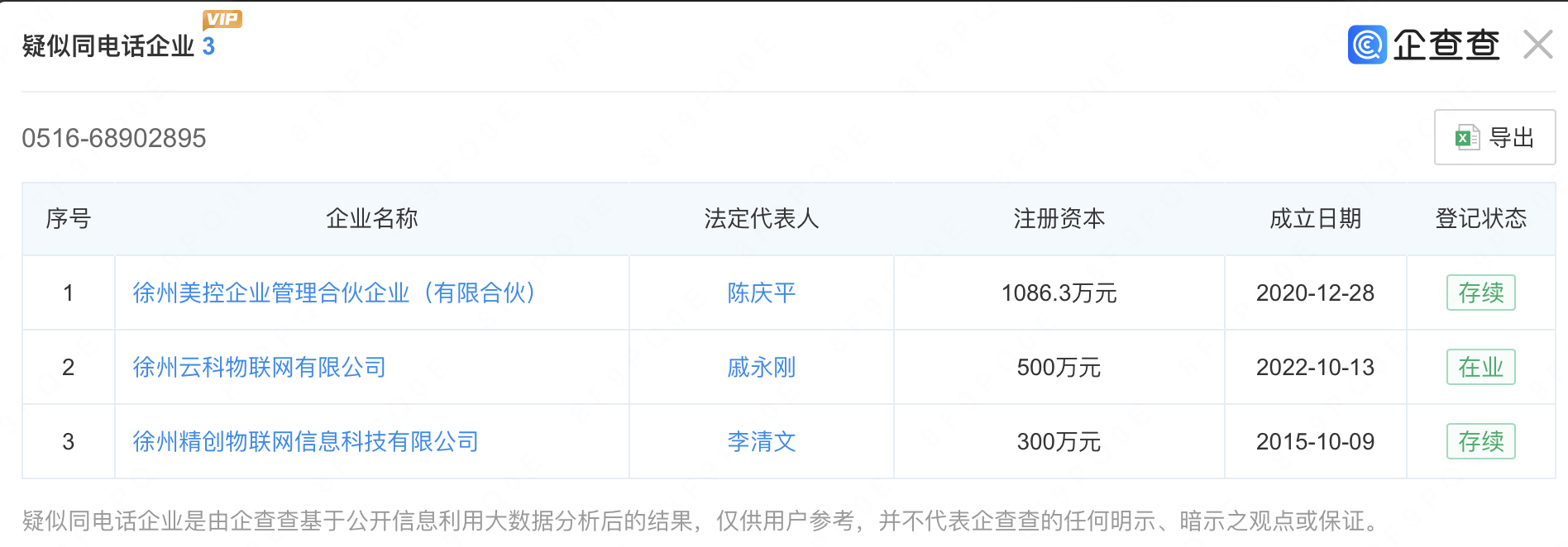 此外,精创电气并未表示与云科物联之间存在关联关系,但公开信息却揭示了双方之间的联系。企查查显示,云科物联在2022年年报中公布的对外联系电话为0516-68902895,而这与精创电气员工持股平台徐州美控企业管理合伙企业以及全资子公司徐州精创物联网信息科技有限公司的联系电话完全一致。
