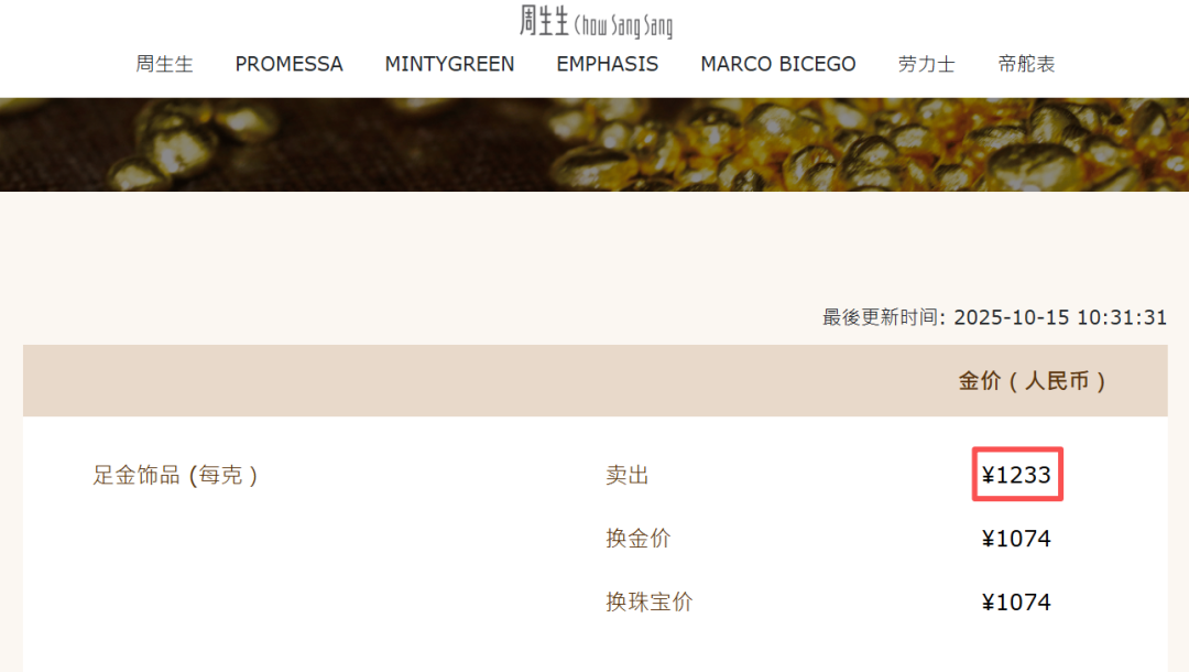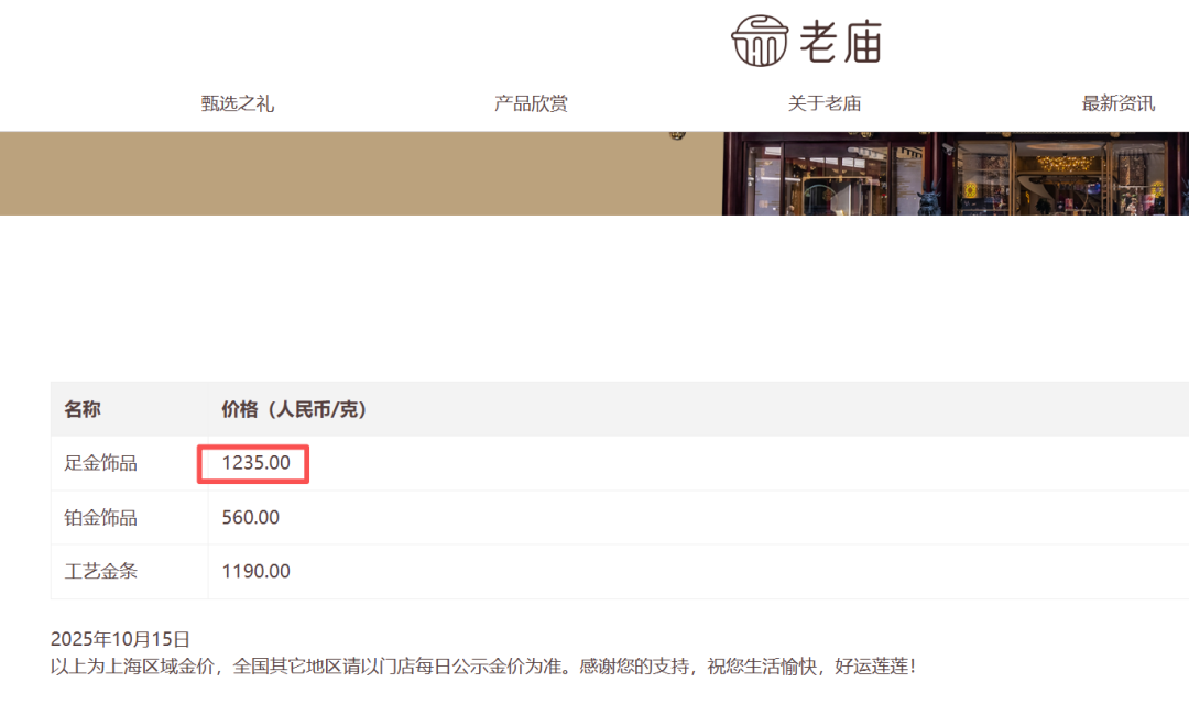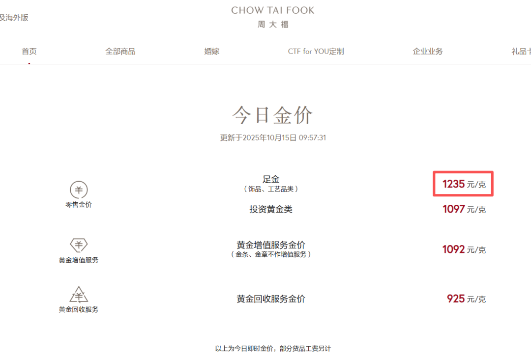 与此同时,国内金饰价格持续走高。10月15日,记者查询各大品牌官网发现,老庙黄金、周大福、六福珠宝等品牌的足金饰品价格均已达到1235元/克,周生生为1233元/克,较前一日均有明显提升。