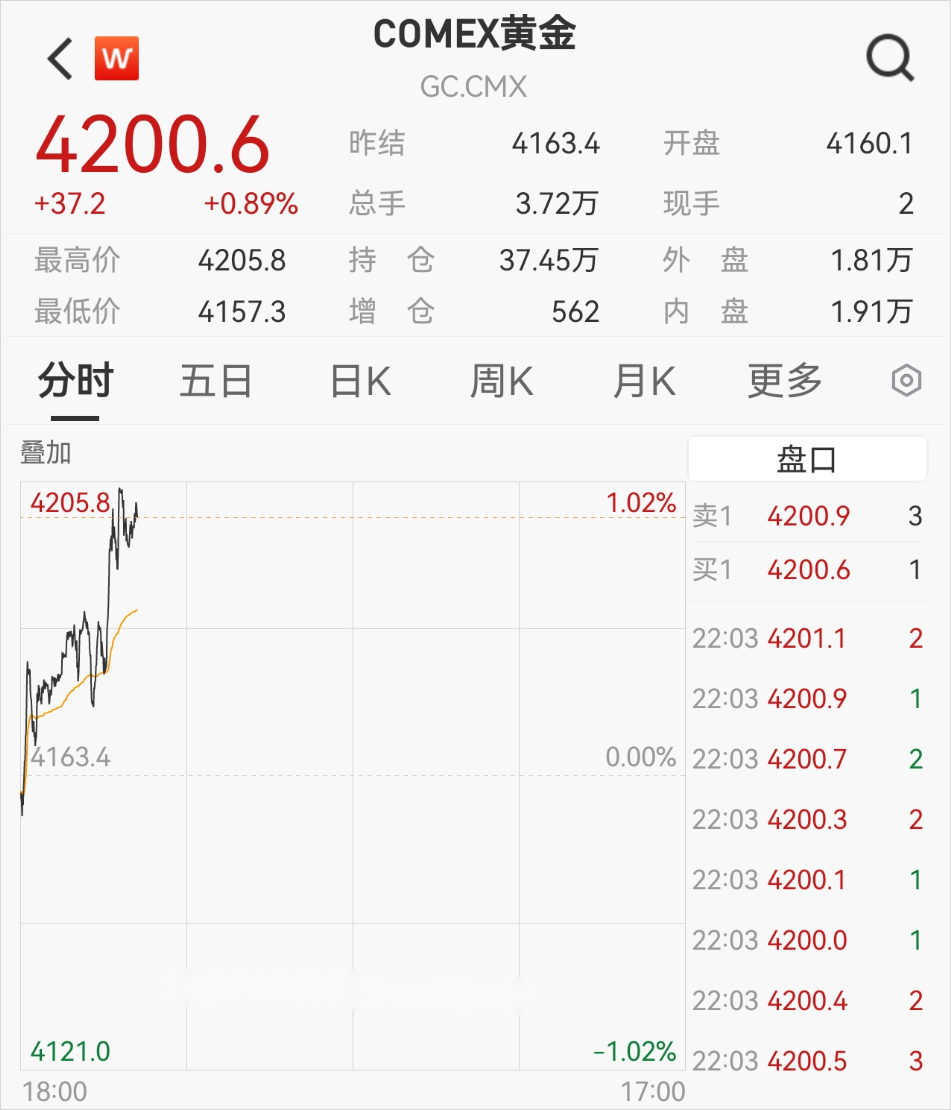 COMEX黄金同步走高,盘中站上4200美元/盎司,涨超1%。